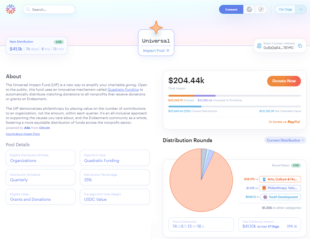 Just a couple of months later, On June 30, 2023, Endaoment announced the unveiling of the first “Universal Impact Pool” (UIP), an innovative new fund which makes use of Gitcoin’s Quadratic Funding mechanism to distribute matching donations to nonprofits who receive donations or grants on Endaoment.